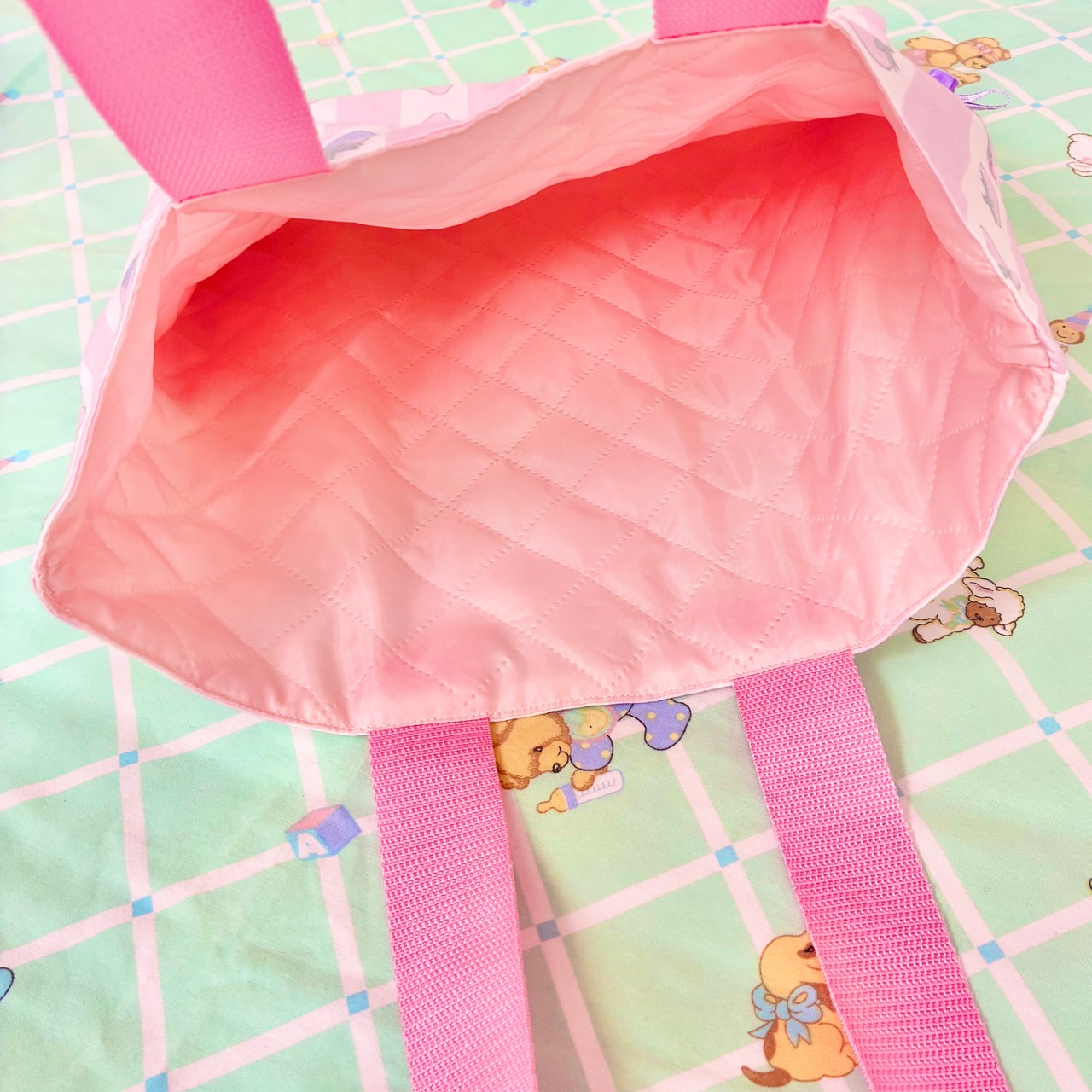裏地はキルト生地なのでしっかりとした作りになっています。持ち手は長めで太さもあるので楽に肩掛けとして使えます。